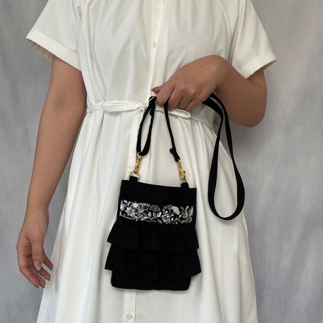 ▷インド製の華やかな刺繍リボン×日本製の上質な帆布⛵️ ▷こだわり抜いた使用感は使い勝手抜群 ▷刺繍好き、人と被らないが好きな方へ ▷華やかでいてコーディネートのアクセントになるのに合わせやすい、とっておきのバッグ * point * ・スマホが入る外ポケ付き ・ショルダー調節でハンドバッグにも ・裏地は防水加工 ・携帯と鍵だけ持ってサッと送り迎え ・エコバッグinで、スーパーへの買い物も手ぶらで 外ポケット・マグネット画像はイメージです * color * →BLACK * size * →バッグ部分 高さ19.5cm・横14.5cm・マチ2.8cm →ショルダー部分 59cm〜108cm * material * →日本製8号帆布 →インド製刺繍リボン ※caution※ 【色・サイズについて】 ・当店のバッグはひとつひとつ手作業でお作りした商品です。 マシンメイドとは違い、サイズ等に若干の誤差がある場合がございます。 ご承知の上ご購入頂きますようお願い致します。 ・商品写真はできる限り実物の色に近づけるよう徹底しておりますが、 お使いのモニター設定、お部屋の照明等により実際の商品と色味が異なる場合がございます。 【商品について】 ・直射日光が当たると変色することがあります。 ・染料の性質上、摩擦や汗などにより色移りする場合があります。 ・刺繍リボンは現地の民芸品のため、縫い目が均一でない場合や、ほつれ、継ぎ目、スパンコールの取れがある場合がございます。 【商品の取扱いについて】 ・アイロンは当て布をして低温で当ててください。 ・刺繍部分へのアイロン禁止 ・刺繍部分のひっかけにご注意ください。
